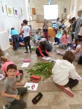 Pour les plus grands, l'après-midi a été rythmée par la visite de l'exposition photos de Dominique Garcia, photographe d'Art : "Les secrets du mini monde au jardin" et par une présentation de Natura 2000 par les animateurs de la CARF. Suite à ce temps calme, les enfants ont fait du Land Art : ils ont élaboré des tableaux à l'aide d'éléments végètaux qu'ils avaient ramassé le matin sur le chemin de la ferme de Serge et Martha. Pendant ce temps, une dizaine d'enfants ont joué à un jeu de société sur les chauves-souris avec un animateur Natura 2000.