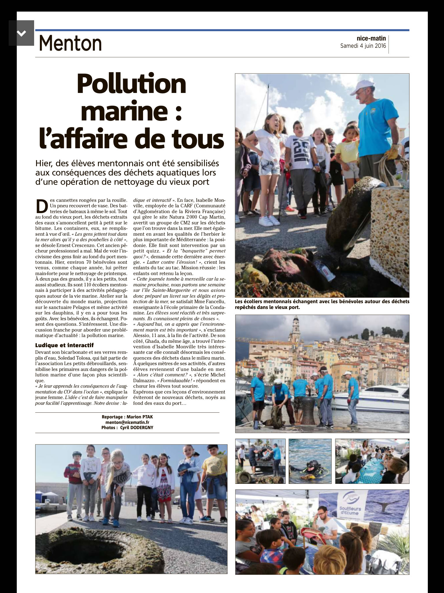 Article Nice-Matin du 4 juin 2016 sur le nettoyage du Port de Menton